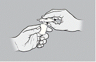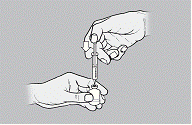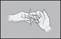 Tartsa határozottan a fecskendőt, és fordítsa el a fehér védősapkát úgy, hogy a védőkorong eltörjön. Csomagolja ki a nagyobb (22G 1½ jellel ellátott) injekciós tűt úgy, hogy a szürke tűvédő sapkát hagyja a helyén. Helyezze szorosan a kicsomagolt tűt az óramutató járásával megegyező irányba tekerve a fecskendőre, ez után távolítsa el a tűvédő sapkát egyenesen felfelé úgy, hogy azt a hüvelyk és mutató nyomva tartja.