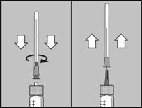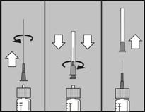 Az óramutató járásával ellenkező irányban enyhén forgatva vegye le a nagyobbik tűt a fecskendőről. Vegye ki a kisebbik, sárga tűvédő sapkával ellátott (30G ½ jelű) injekciós tűt, de a tűvédő sapkát még ne vegye le róla. Az óramutató járásával megegyező irányban szorosan tekerve helyezze fel az imént kibontott (30G ½ jellel ellátott) kisebb méretű tűt a fecskendőre, majd távolítsa el a tűről a műanyag védősapkát egyenesen felfelé úgy, hogy azt a hüvelyk és mutató ujjával nyomva tartja.