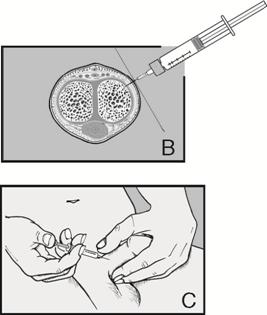 · Péniszét tartsa határozottan, szabad kezével fogja meg a fecskendőt és az injektálás helyére merőlegesen, a kezelőorvosa által megmutatott módon szúrja keresztül a tűt a bőrön és vezesse a barlangos testbe, úgy hogy elkerülje a vénákat vagy egyéb látható vérereket. A beadás szögét a B. és C. ábrák mutatják. A fecskendő dugattyúját nyomja határozottan. Ha a Caverject‑et nem tudja könnyen kinyomni a fecskendőből, kicsit mozdítsa el a tűt és próbálja újra.