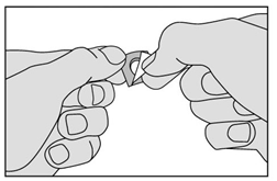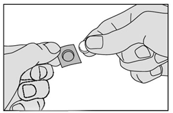 3. Ne nyomja keresztül a gyógyszert a fólián! Ezzel károsíthatja a gyógyszert, mivel az könnyen törik. Ehelyett hajtsa vissza a fólia megjelölt sarkát, majd húzza le!