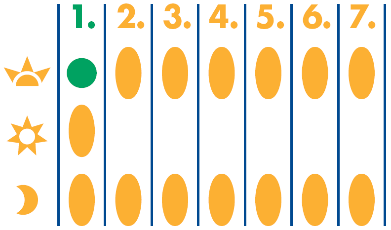A CalciviD csomagolásának hátlapja is segítséget nyújt a készítmény pontos szedéséhez: - a csomagolás hátlapján a számok a napok sorrendjét jelzik, - a felkelő nap, a delelő nap, illetve a hold szimbólum pedig azt jelöli, hogy az adott filmtablettát reggel, délben vagy este kell-e bevenni. - a hét első napjának reggeléhez tartozó buborék üres, és a hátlapon zöld mezőben figyelmeztető felirat jelzi, hogy ekkor kell bevennie a heti 1 darab Sedront (ezt másik, teljesen zöld hátlapú, kisebb buborékfólia csomagolásban találja). CalciviD-et a hétnek ezen a napján délben és este kell bevenni. - a hét többi napján ne vegyen be Sedront, CalciviD-et pedig reggel és este vegyen be. A CalciSedron-D Trio-t minden héten a fent bemutatott módon kell szedni. Kérjük, hogy a következő részletes szedési utasításokat is gondosan olvassa el! |