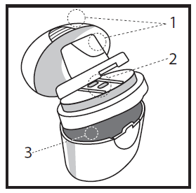 | Az Elpenhaler készülék három részből áll: - szájfeltét és kupakja (1). - A felület (2), amelyen a két buborékcsomagolású fóliacsík elhelyezkedik (gyógyszertámasztó felület). - A tárolódoboz (3), amelyben a két buborékcsomagolású fóliacsík található. A három rész egymáshoz csatlakozik, és egymástól külön nyithatóak. |