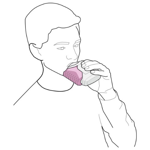 2. Tartsa távol szájától az inhalátort. Megerőltetés nélkül jól lélegezzen ki. Ne lélegezzen vissza az inhalátorba.