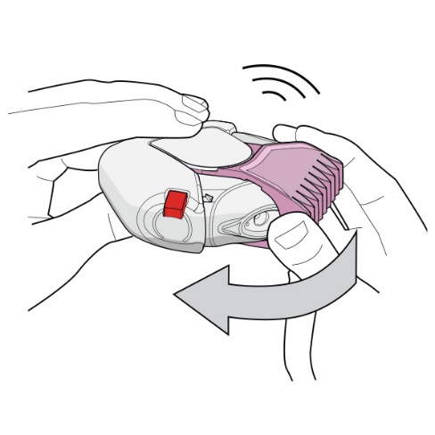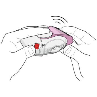 1. Az inhalátor kinyitásához tartsa a készüléket vízszintesen az egyik kezével. A hüvelykujjával nyomja le a piros gombot (lásd 1. ábra), majd a másik kezének hüvelykujjával a szájrész világos rózsaszín (50 mikrogramm/100 mikrogramm hatáserősség) vagy rózsaszín (50 mikrogramm/250 mikrogramm hatáserősség) fedelét fordítsa el kifelé, amennyire tudja, ameddig egy kattanást nem hall (lásd 2. ábra). Így megnyílik a szájrész kis nyílása, és egy adag gyógyszer a szájrészbe kerül.