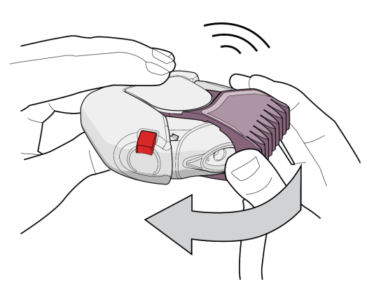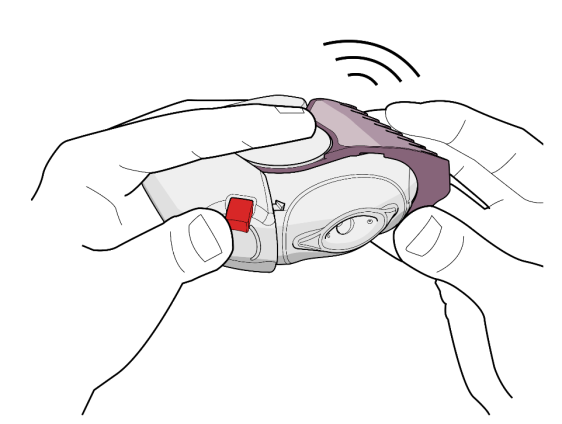 1. Az inhalátor kinyitásához tartsa a készüléket vízszintesen az egyik kezével. A hüvelykujjával nyomja le a piros gombot (lásd 1. ábra), majd a másik kezének hüvelykujjával a szájrész mályvaszínű (50 mikrogramm/500 mikrogramm hatáserősség) fedelét fordítsa el kifelé, amennyire tudja, ameddig egy kattanást nem hall (lásd 2. ábra). Így megnyílik a szájrész kis nyílása, és egy adag gyógyszer a szájrészbe kerül.