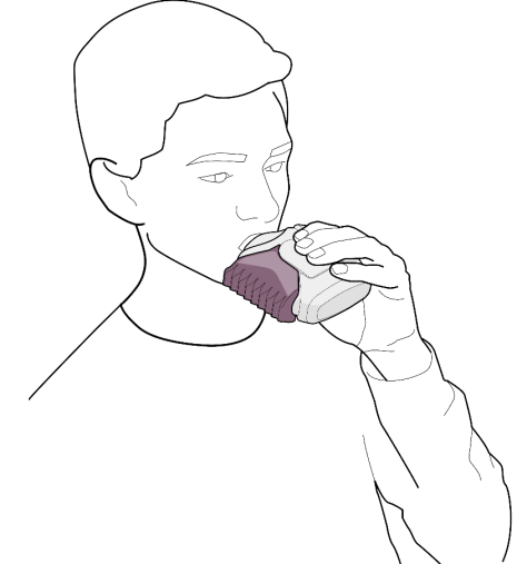 2. Tartsa távol szájától az inhalátort. Megerőltetés nélkül jól lélegezzen ki. Ne lélegezzen vissza az inhalátorba.