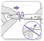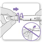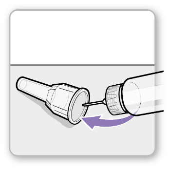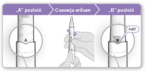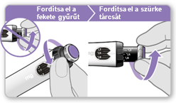 Megjegyzés: Ha a fekete gyűrűt nem tudja elfordítani, tartsa nyomva a lila színű injektáló gombot, amíg a kattanó hang meg nem szűnik. Ezután próbálja újra és állítsa be az adagját. Vegye figyelembe, hogy a tűből folyadék fog kifolyni.