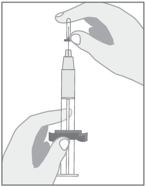 Vegye le óvatosan a műanyag védőkupakot úgy, hogy egyenesen lehúzza azt a fecskendőről. Ha a kupak nagyon szorosan illeszkedik, húzás közben kicsit forgassa el.