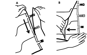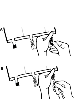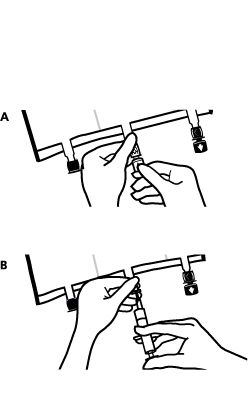 • Közvetlenül az infúziós szerelék csatlakozása előtt törje le a kék színű csatlakozó garanciazáras záróelemét. (A). Figyelmeztetés: Az infúziós szerelék csatlakozójának membránja steril. • Használjon nem-szellőző infúziós szereléket, vagy zárja be a légbeeresztőt a szellőző szereléken. • Tartsa szilárdan a csatlakozót. • Az infúziós szerelék hegyét teljes hosszában szúrja át a csatlakozó membránján. Az infúziós szerelék hegyének teljes beszúrása biztosítja a szerelék megfelelő rögzítését. Figyelmeztetés: Az infúziós szerelék csatlakozójának belső része steril. |