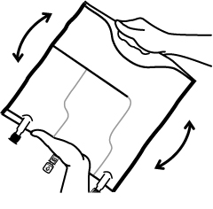 2. Összekeverés • Helyezze a zsákot vízszintes felületre. • Tekerje fel a zsákot először jobb kézzel szorosan a fogantyú felől a csatlakozók irányába, majd bal kézzel erőteljes nyomást alkalmazzon, míg a függőleges hegesztések felnyílnak. A függőleges hegesztések a folyadékra alkalmazott nyomás hatására felnyílnak. A hegesztések a külső csomagolás eltávolítása nélkül is felnyílnak. Figyelmeztetés: A zsák kinyitása során a vízszintes hegesztés zárva marad; így is teljes az összekeverés. |