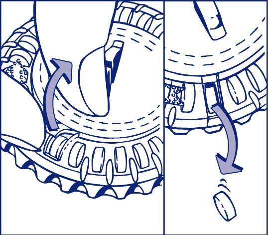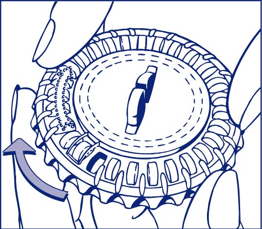 A következő nap egyszerűen forgassa el egy tablettahellyel az átlátszó gyűrűt a nyíl irányába, az óramutató járásával megegyezően. Billentse ki a következő tablettát. Ügyeljen rá, hogy naponta csak 1 tablettát vegyen be.